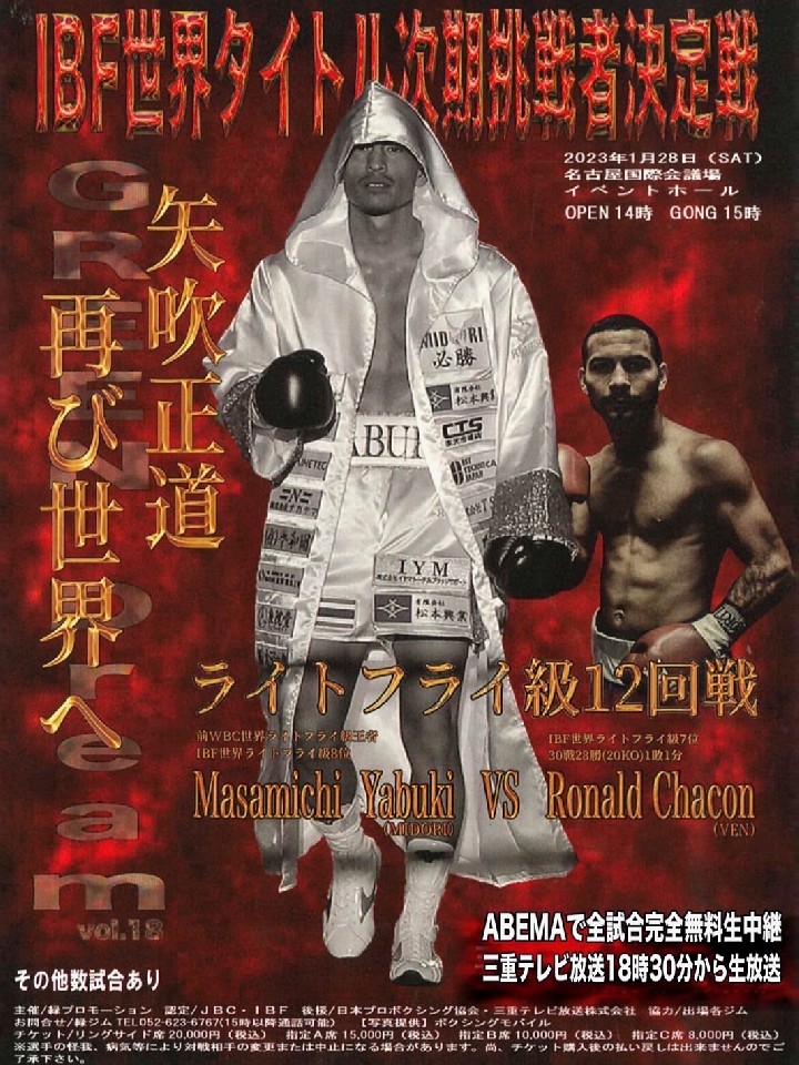 世界王座奪還を目指す矢吹が、世界挑戦者決定戦に臨む。今年9月に地元三重でタノンサック・シムシ―(タイ/グリーンツダ)に7回TKO勝ちし再起に成功。抜群の破壊力と勝負どころを逃さない嗅覚で健在ぶりをアピールした。チャコンは、30戦28勝(20KO)1敗1分のオーソドックススタイル。デビュー戦で敗れて以降、引き分けを挟んで28連勝中だ。矢吹の強打爆発に期待!