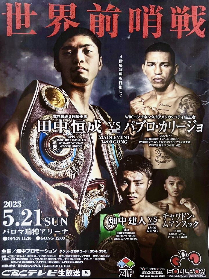 世界4階級制覇を目指す田中が世界前哨戦に臨む。昨年12月には世界上位ランカーのヤンガ・シッボキ(南アフリカ)に完勝。持ち前の高い攻撃力で力の差を見せた。スーパーフライ級にアジャストし仕上がっている。WBC世界Sフライ級14位のカリージョは、かつて井岡一翔(志成)とも拳を交えたことがある。2021年4月にドニー・ニエテス(比)に敗れた後は引き分けを挟んで3連勝中だ。