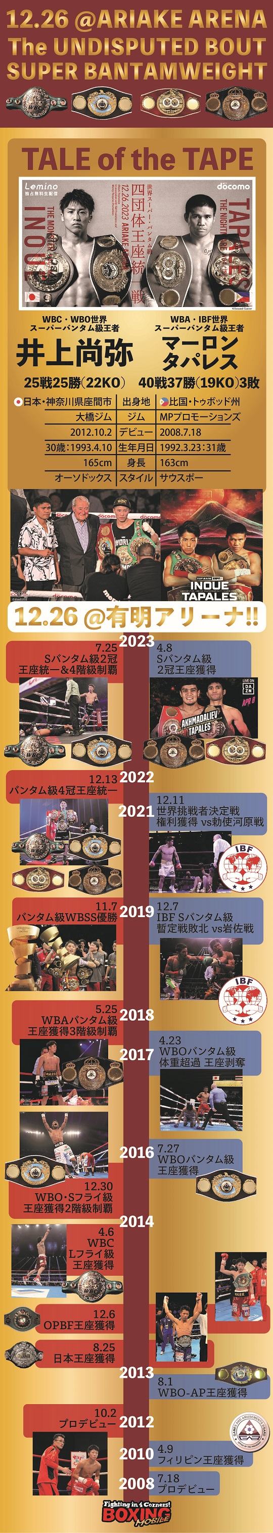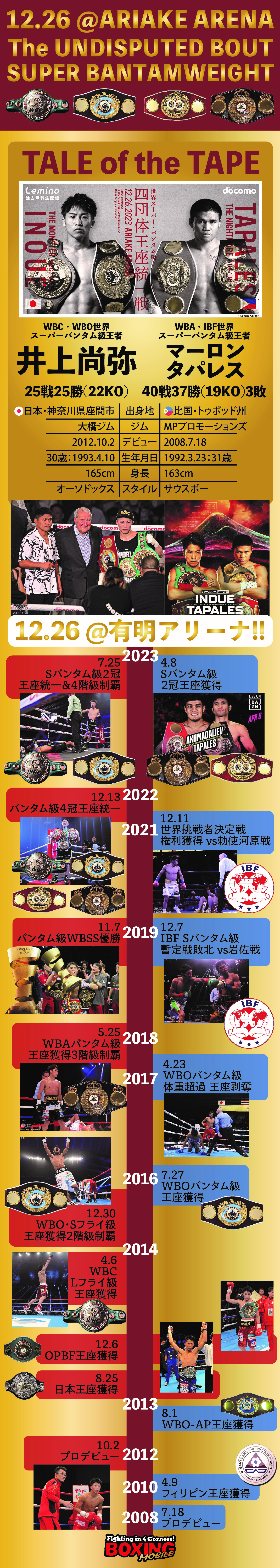 井上尚弥が史上2人目となる2階級での4団体王座統一戦に臨む。今年7月に行われたスティーブン・フルトン(米)との一戦では、ジャブの差し合いでペースを奪うと、ハイレベルな攻防を繰り広げる中、1枚も2枚も上回り最後は倒し切った。階級アップによる体格差は全く感じさせず、Sバンタム級最強のフルトンに圧勝しあらためて強さを証明した。WBA・IBF世界Sバンタム級王者のタパレスは今年4月にアフマダリエフ(ウズベキスタン)に挑戦し2-1の判定勝ちで王座奪取に成功した。後ろ重心の構えからジャブ、左オーバーハンドにつなげるのを得意とする。ディフェンス力が高く、技術の高いサウスポーだ。モンスターの歴史的快挙に期待!