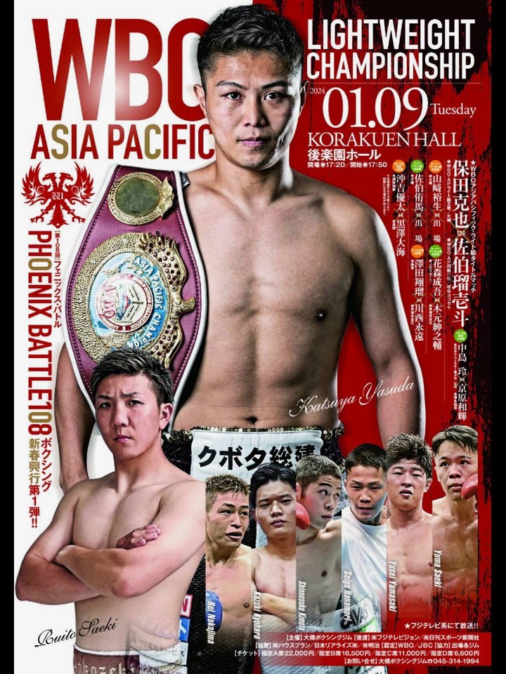 WBO-AP王者・保田のV2戦。昨年9月の防衛戦では、難敵のジュン・ミンホ(韓国)に付け入る隙を与えず安定した試合運びで大差判定勝ち。前の手を上手く使いながらスピードを活かした攻撃を身上とする技巧派サウスポーだ。タイトル初挑戦の佐伯は、現在3連勝中。ジャブを軸に丁寧な組み立てを得意とする。ここ数戦、パワーアップしKO勝ちが増えてきた。距離が遠い保田をどのように攻略していくか?
