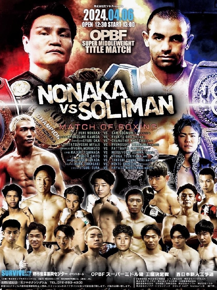 見どころ:現役最年長の野中がOPBF東洋太平洋3階級制覇を狙う。昨年6月に移籍初戦を勝利した野中は12月の試合を2回TKO勝ち。勝てば46歳4ヶ月でのタイトル獲得で国内最年長王座奪取を更新する。元IBF世界ミドル級王者のソリマンは、キャリア27年目の大ベテラン。ロングレンジから相手の隙を見て単発の右ストレートを決める試合巧者で距離が詰まるとクリンチで相手の攻撃を遮断する。野中としては、序盤から積極的に仕掛けていきたい。