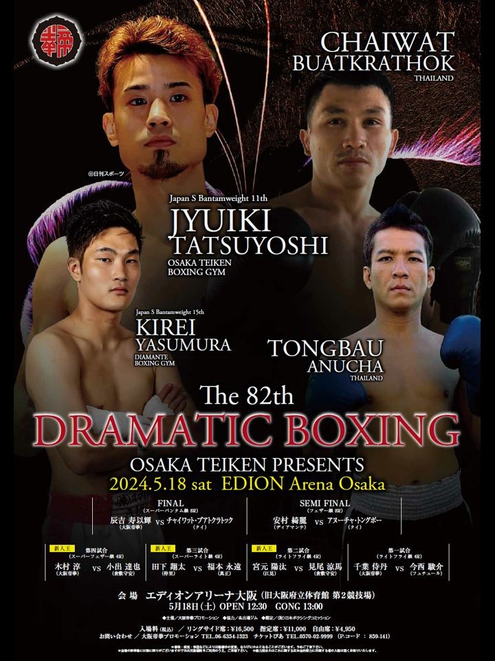 日本Sバンタム級12位の辰吉は、今年1月に与那覇勇気(真正)に判定勝ちしてランキング返り咲き。左右ともに力強いパンチと豊富な手数が魅力の右ボクサーファイターだ。チャイワットは、2022年10月に中嶋一輝(大橋)と対戦し8回TKO負け。しかし、ダウンを奪うなど健闘した。左クロス、右フックと当て勘が良いサウスポーだ。辰吉はキャリア2度目のサウスポーとの対戦だ。