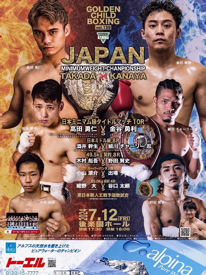 日本ミニマム級王者の高田のV4戦。今年3月に伊佐春輔(川崎新田)に判定勝ち。ダウンを奪う快勝だった。バネを活かした多彩なコンビネーションが光る右ボクサーファイターで、4戦ぶりのKO勝ちを狙う。挑戦者の金谷は、今年2月に小林豪己(真正)とのWBO-AP王座決定戦で敗れて以来の再起戦。右クロスの当て勘に優れた好戦的なタイプだ。序盤から積極的に仕掛けていきたい。