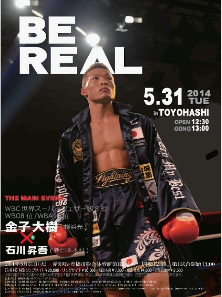 注目:昨年の大晦日、内山高志に挑み、一度はダウンを奪うも判定で敗れた前日本同級王者の金子が、故郷・愛知県豊橋市で再起の凱旋試合を行う。年間最高試合賞を受賞した激闘から1ヶ月後には基礎トレーニング中心の宮崎合宿を行い、ハードな走り込みでフィジカルとスタミナを強化中。再起、そしてその先の世界再挑戦に向け、高いモチベーションで再起を図る。 一方、対戦相手の石川は、昨年6月に金子の同門の李冽理と東洋太平洋フェザー級王座決定戦を争い判定負けし、以後も2連敗と白星に恵まれていないが、勝てば一気に世界ランクが手に入るビッグチャンスとなった。