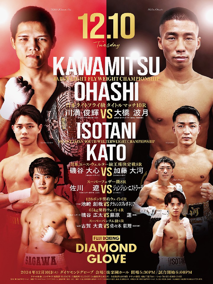 日本Lフライ級王者の川満のV2戦。パンチが強くチャンスに一気に仕留めに行く爆発力が魅力の攻撃型だ。タイトル初挑戦の大橋は、昨年8月に4年3ヶ月ぶりにカムバックすると3試合連続KO勝ち。今年4月に松江琉翔(大成)に5回KO勝ちしランキング入りを果たした。独特のタイミングから繰り出す右クロス、左フックは決定力がある。お互いに好戦的でKO決着必至の一戦。