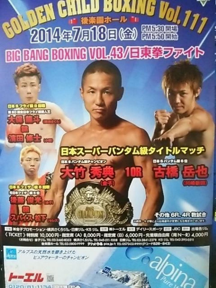 注目:日本王座を4度防衛中の"磐石王者"大竹に、同級6位の古橋が挑む。古橋は今回がタイトル初挑戦。08年にバンタム級全日本新人王となり、一時低迷したが昨年6月に鈴木徹(大橋)を7回TKOで破り日本ランクに復活。現在3連勝と勢いにのり、チャンスを掴んだ。攻撃型でありながら鉄壁のガードを誇る大竹を、古橋がフットワークでどう崩すのか注目だ。※7/10、大竹が怪我のため、10月に延期されると発表された。