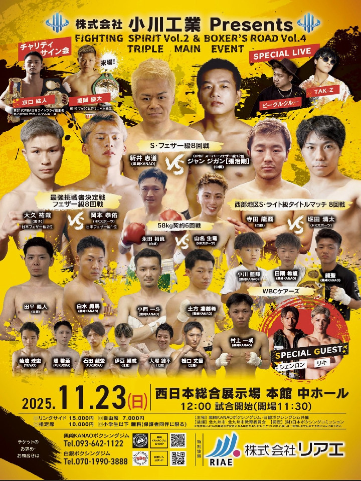 元日本ランカーの新井は、今年7月以来の再起戦。鋭い踏み込みから決定力の高いパンチでなぎ倒す好戦的なタイプ。OPBF東洋太平洋Sフェザー級15位のジガンは、プレスをかけながら思い切りの良い右ストレートから切り込む右ファイター。中間距離でスリリングな打ち合いが見られそうだ。