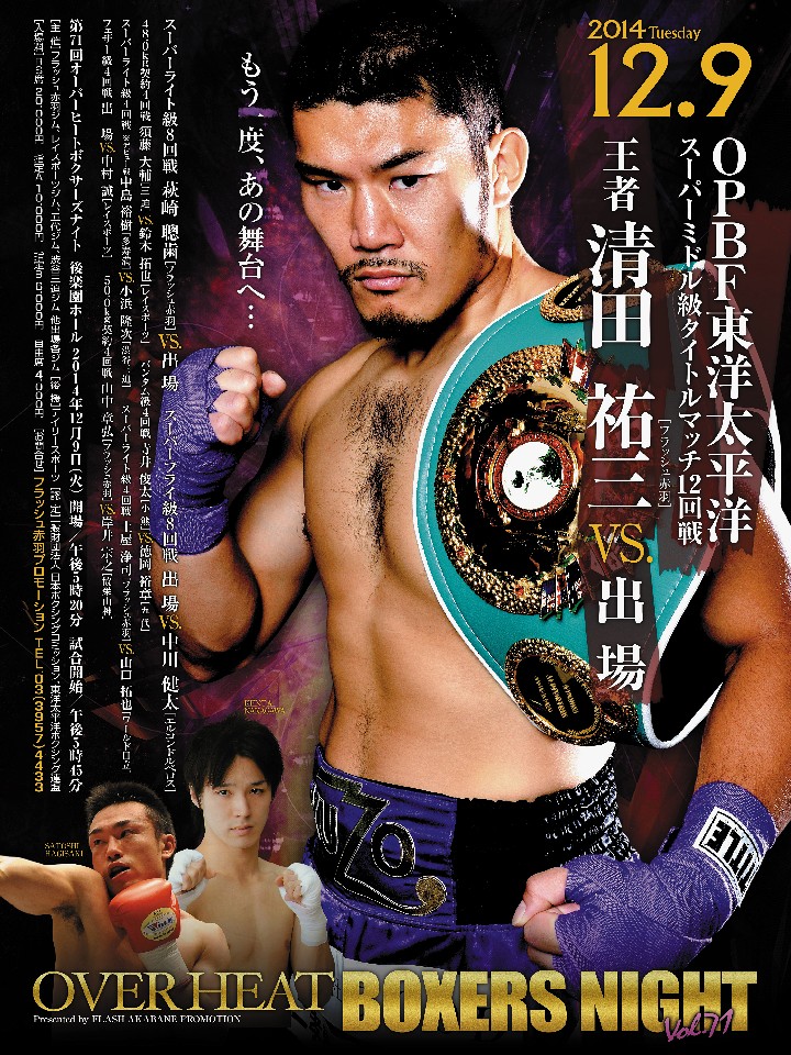 注目:清田は昨年12月の同王座再獲得後、7月のV1戦が相手の欠場により流れ、今回が1年越しの初防衛戦となった。本来であれば決定戦で勝った王者には指名試合が義務づけられるが、もはや日本とアジアの枠を超えた清田には、その相手すら見つけるのが困難な状況だ。ようやく見つけた元フィジー王者のチャンド(35)も現在は2連敗中と精彩さを欠き、WBA傘下のPABAミドル級では8位につけるが、現時点(11/7)でOPBF入りはしていない。戦績は16勝(10KO)13敗4分。清田にとっては昨年の世界挑戦で一度は手放したベルトだが、08年4月以来、実質6年半も守り続けた誇りもあるだろう。だが、そろそろ次の段階を模索する時期に来ているのも事実だ。