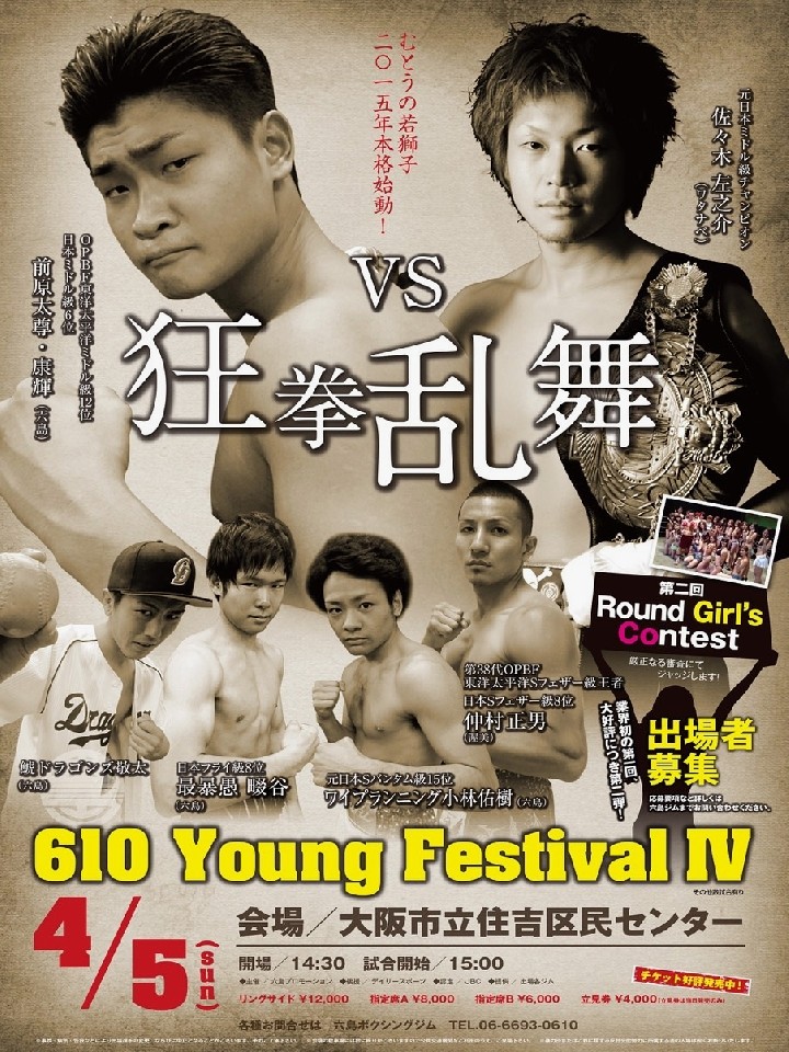 注目:元日本ミドル級王者、佐々木左之介に13年度全日本新人王MVPの前原が挑む。怪我からの復帰戦を前に交通事故という不運のため試合間隔が開いた元卓球選手の佐々木だが、抜群の身体能力と試合中の修正力には定評がある。一方、プロ野球選手を目指す少年時代を過ごした前原は、強気な性格と向上心で2015年も大きな飛躍を誓う。