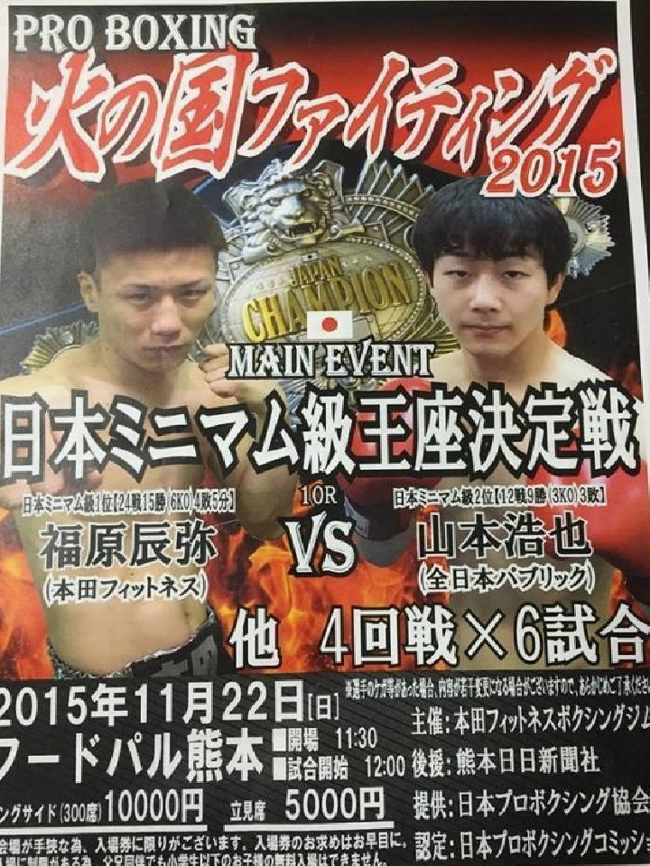 注目:大平剛(花形)が返上した王座を懸け、福原と山本が熊本で激突!サウスポーの福原は、13年12月の現OPBF・Sフライ級王者、井上拓真(大橋)のデビュー戦で判定負けを喫したが、以降は5戦して3勝2分と負けなし。粘り強さに磨きがかかった。対する山本は、好戦的な右ボクサーファイター。タイトルは昨年9月の日本王座挑戦(大平)、今年2月の中国でのWBCインターナショナル同級王座決定戦に続き3度目。9月5日に6位・須田拓弥(沼田)とのランカー対決を制し、今回のチャンスを掴んだ。