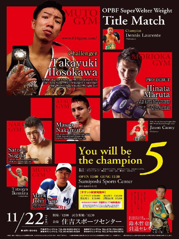 昨年12月に湯場忠志を破り王座に就いたローレンテに細川が挑む!王者と同じサウスポーの細川は、今年に入ってから4月の日本王座挑戦に続く2度目のタイトル挑戦。ファイター同士のパワフルな試合が楽しめそうだ。