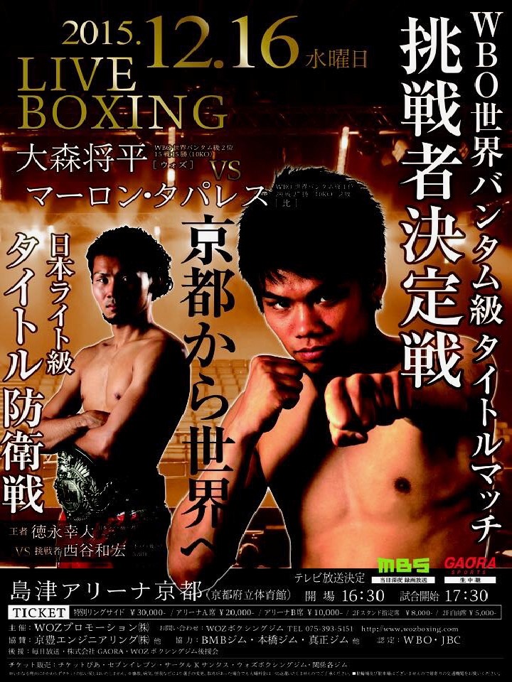 注目:関西若手ホープNO.1の大森に、いよいよ世界への扉が開かれた。対戦相手のタパレス(23/29戦27勝(10KO)2敗)は現地フィリピンで「パッキャオ2世」と言われるこちらもフィリピン若手NO.1ボクサー。大森は強敵を相手に世界で戦えることを証明できるか。