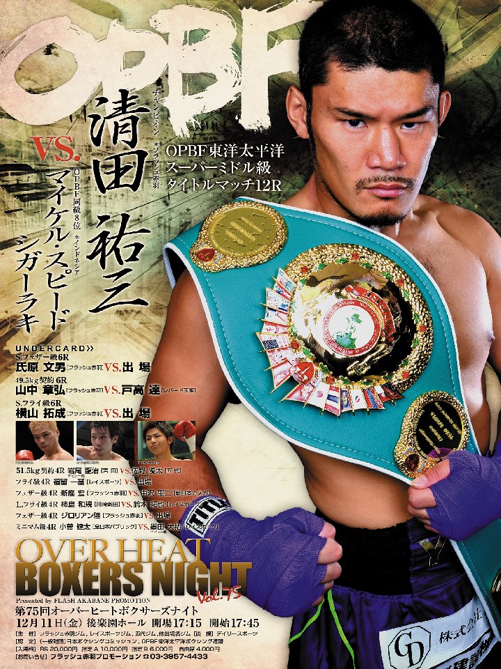 注目:前回の防衛戦でまさかのダウンを喫してしまい、試合後は反省しきりだった清田。3度目の防衛戦となる今回は同級8位のマイケル・スピード・シガーラキ(インドネシア)を迎える。33戦16勝(14KO)15敗2分。今年3月に柴田明雄とノンタイトル戦で拳を交え、4回TKOで敗れたが何度ダウンしても立ち上がる粘りを見せた。今回はタイトルがかかっている分、より高いモチベーションで向かってくることが予想される。前回の世界挑戦から2年以上経ちモチベーションの低下など懸念されるが、ここは清田らしい豪快なKOを期待したい。