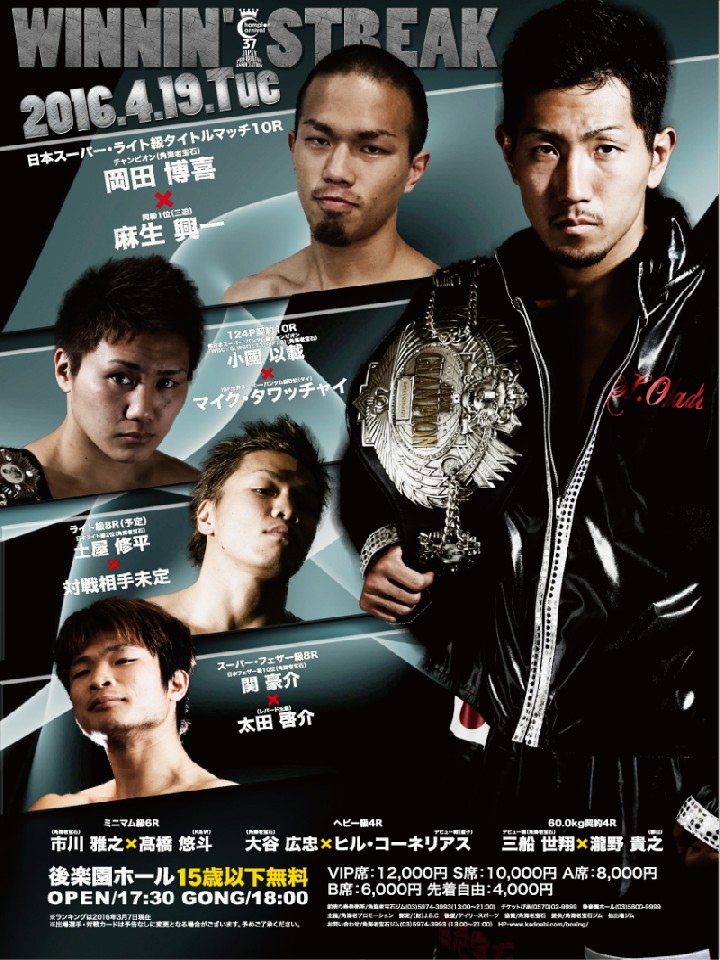 注目:1月、中澤将信との王座統一戦で多彩な左を見せて衝撃的なKO勝ちで防衛を果たした岡田が麻生とのリターンマッチに臨む。前回はダウン寸前の壮絶な打ち合いの末、岡田が辛勝したが1年9ヶ月を経て岡田は急成長を遂げた。麻生が前に出て岡田が迎え撃つ展開は変わらないはず。岡田は前回より明白な勝利を挙げチャンピオンカーニバルMVPを狙いたいところ。麻生は打たれてもなんとか懐に入り勝負したい。