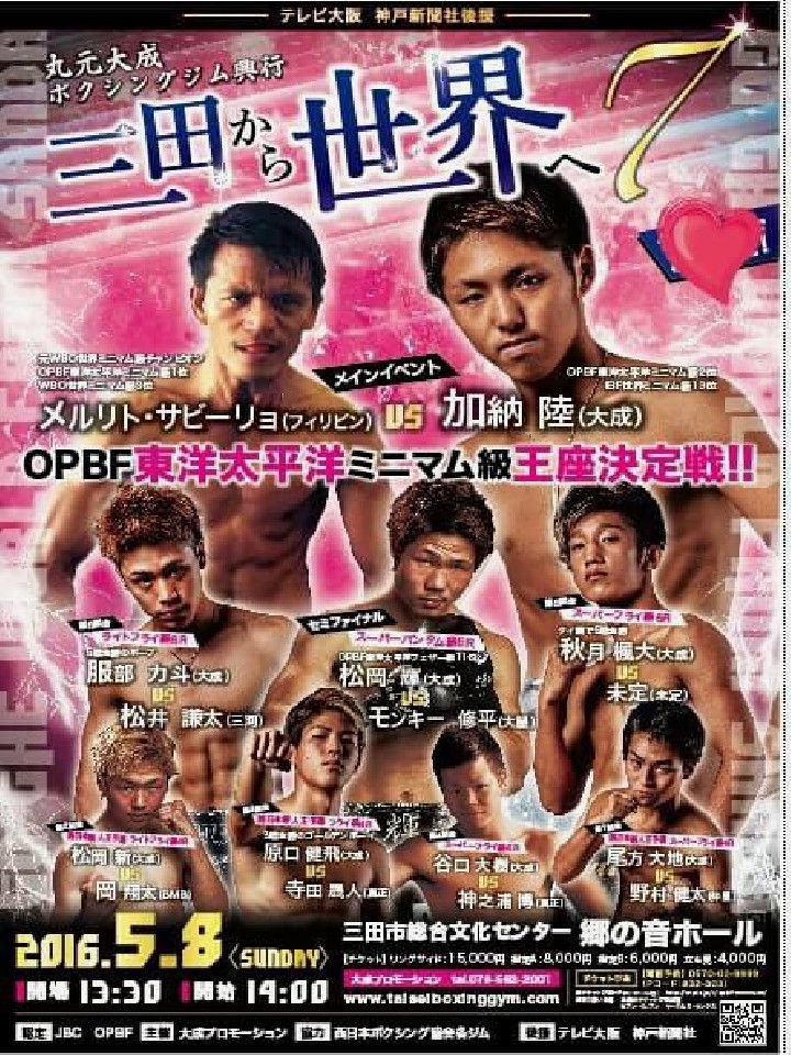 注目:日本人最年少世界王者記録の更新(現在の記録は、井岡弘樹氏が持つ18歳9ヶ月10日)を狙う加納が元世界王者のサビージョと東洋太平洋王座をかけて争われる一戦。現在WBO世界ミニマム級1位のサビージョ(28戦25勝12KO2敗1分)は全盛期ほどではないにしろ、加納がこれまで戦ってきた相手より数段上の実力の持ち主だ。スピードと回転力で上回る加納は12ラウンド、常に忙しく動き回るスタミナと集中力が要求される。経験で大きく上回るサビージョに主導権を握り続けるのは困難を極めるため、我慢比べの展開が予想される。加納にとって厳しい試合になるが若さと勢いで世界ランク上位を目指す。