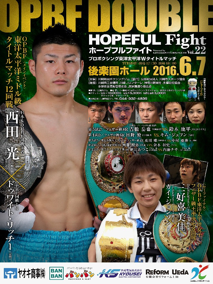 注目:大番狂わせだったのか?東洋太平洋ミドル級、新チャンピオン西田光の初防衛戦。このベルトを守っていた前チャンピオンで先日、引退を決意した柴田明雄(ワタナベ)との一戦はラッキーウィンではなかったことを証明するにはモッテコイの相手、ランキング1位のオーストラリア人、ドゥワイト・リッチー戦。