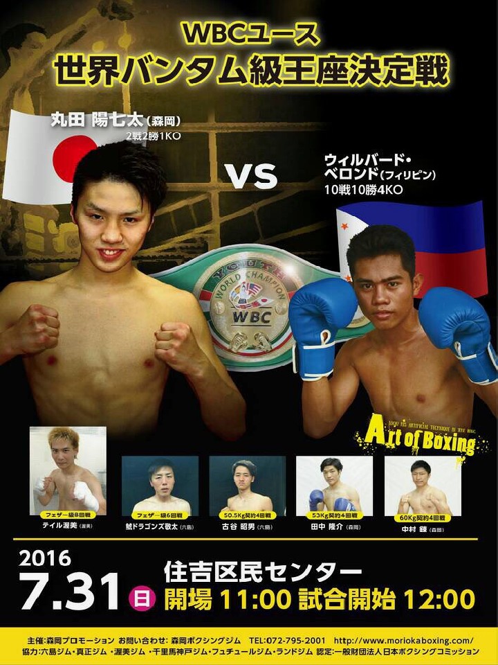 注目:関西期待の新鋭・丸田のプロ転向3戦目。177pの長身から繰り出される打ち下ろしの右ストレート、角度のある左ボディを武器に日本同級11位にランクされる丸田。今回はWBCユース・スーパーバンタム級王座決定戦を無敗の比国人と争う。現在、元WBO世界スーパーフライ級1位のワルリト・パレナス(比国)と連日、激しいスパーリングで腕を磨いている丸田。つい半年前には井上尚弥(大橋)に指名挑戦者として王座に挑んだ実力者をスパーリングパートナーに選ぶあたり、今回の試合に賭ける意気込みが感じられる。拳を交えるベロンドは10戦全勝(4KO)。知名度のある相手との試合はないが油断は禁物。丸田としては大差判定、もしくは中盤以降のノックアウト勝ちでファンにアピールする試合を期待したい。