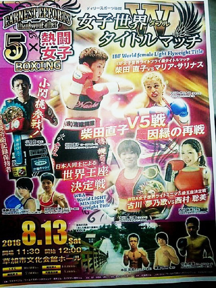 注目:連日の猛暑の中、埼玉県草加市で行われる「熱闘!女子ボクシング」のメインイベントを飾るのはIBF女子世界ライトフライ級王者、柴田直子(ワールドスポーツ)の6度目の防衛戦。挑戦者はリターンマッチとなるマリア・サリサス(メキシコ)。昨年11月の対戦ではサリサスのパワー溢れる攻撃に大苦戦。終盤にポイントを挽回して三者三様の引き分けに持ち込んだ。判定に納得のいかないサリサスは前回以上の気迫でベルトを奪いにくるだろう。ここ数戦、満足のいく内容でないと語る柴田は返り討ちにして、さらなるビッグマッチに繋げたい。若干の緩みがあるサリサスのわき腹に得意の左ボディ当てて体力を削り、後半ストップが理想の展開か。体調管理が難しい真夏の試合で当日のコンディション調整も鍵を握る。
