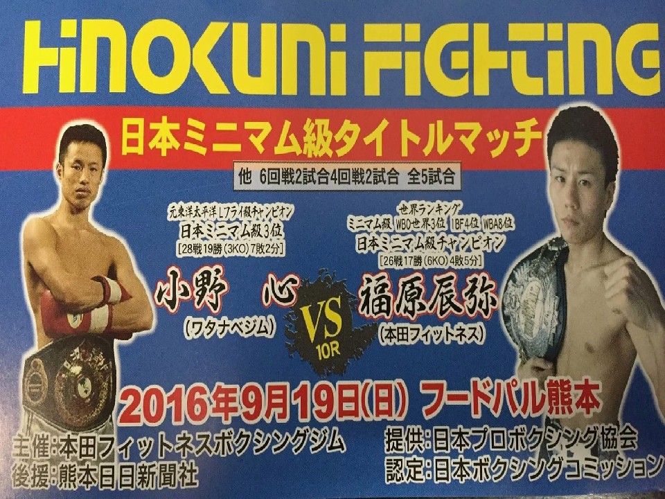 注目:現在、九州の所属ジムで唯一の日本王者であるサウスポー福原(本田F)の2度目の防衛戦。3月の初防衛戦では、当時WBO世界1位の榮拓海(折尾)との激しい打撃戦を制して力強さをみせた福原。ボディ打ちを得意とし、豊富な手数を武器にする好戦的なファイター。一方、挑戦者の小野心(ワタナベ)は元東洋太平洋王者で高山勝成(仲里)の持つ世界王座に挑んだ経験のあるベテランサウスポー。7回までポイントでリードする健闘を見せた。敵地・熊本でのアタックだけに不利は否めない小野はベルトを獲るための仕掛けがほしい。福原のボディ攻撃にどれだけ耐えることができるのか。WBO世界ミニマム級3位に位置する福原は世界へのカウントダウンが始まっているだけにここは是が非でも落とせないだろう。