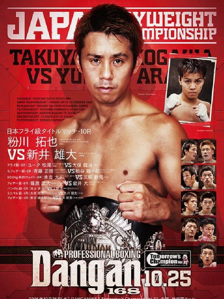 注目:再び王座に返り咲いてから安定感のあるボクシングで防衛ロードを突き進んでいる粉川の4度目の防衛戦。相手はこれがタイトル初挑戦のサウスポー新井。無尽蔵のスタミナと旺盛な手数、さらには老獪なテクニックとピンチになっても動じないメンタルの強さで国内フライ級では1歩も2歩も抜きに出ている粉川。ここは王者の貫禄を見せつけて5年以上遠ざかっている世界戦への足掛かりにしたい。一方、粉川に挑む新井は昨年10月に金沢でランキングを奪い、2戦目でタイトル挑戦へとこぎつけた。スピードを生かした思い切りの良い攻撃を持ち味だ。実績では大きく見劣りする新井としては粉川に一泡吹かせる"秘策"がほしい。