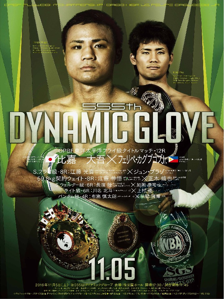 注目:圧倒的な攻撃力でデビューから10戦すべて相手をキャンバスに沈めてきた比嘉がOPBF初防衛戦を迎える。前回7月は難敵アーデン・ディアレ(フィリピン)から3度のダウンを奪い圧巻のKO劇でタイトルを強奪した比嘉。野木丈司トレーナーの厳しいトレーニングで一戦ごとに着実に成長を見せ、いま最も世界を期待されるホープの一人に挙げられるまでになった。対戦相手のカグブコブjrはこれが初来日の戦績13戦6勝(2KO)2敗5分のサウスポー。5連勝中と好調をキープし一気にタイトル挑戦のチャンスを得た。勢いのある比嘉だが、初めて守る立場での試合、そしてサウスポーとの対戦は未知数。しかし、それらのほんの少しの不安要素も吹き飛ばしてしまうぐらいのノックアウトをファンは期待しているはずだ。