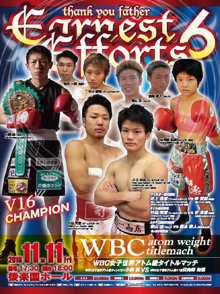 注目:WBC女子アトム級王座を16度防衛、8年間ものあいだベルトを保持し続けている絶対王者の小関の1年ぶりとなるV17戦。相手はこれが世界初挑戦となる日向野。昨年10月に宮尾綾香(現ワタナベ)との王座統一戦で初回にダウンを喫したものの、中盤から明確にポイントを奪いWBA王座を吸収、女子世界最多防衛をはたした小関。8月のノンタイトル戦でも初回KOで安定した戦いぶりは衰えを見せない。今回の防衛戦をクリアして2階級制覇を目指すためにも負けはおろか苦戦も許されない。日向野は旺盛な手数と負けん気の強さを武器に8月にタイ人を初回KO勝ちでA級初戦を飾った。実績で大きく上回る小関の有利は動かせないが、失うもののない日向野は挑戦者らしく果敢に高い壁に挑んでほしい。