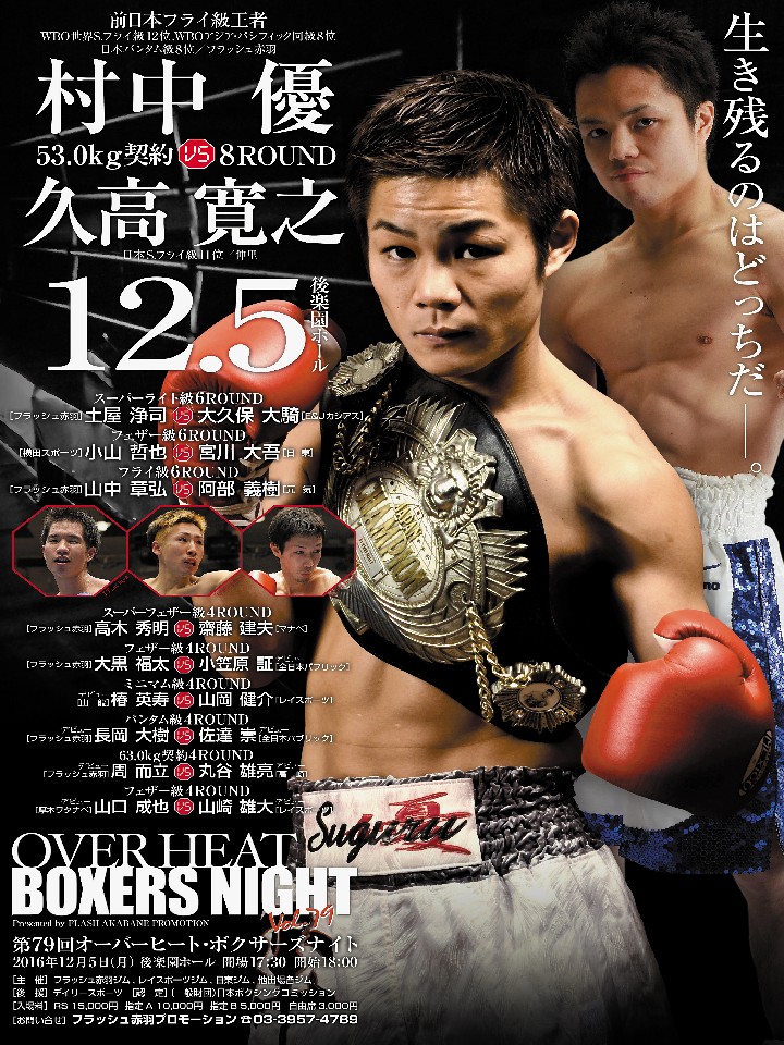 注目:今年4月に1年ぶりに戦線復帰した前日本フライ級王者の村中が過去4度の世界タイトル挑戦経験のある久高を迎える一戦。前戦、終始ペースを握っていたものの、KO負けのないフィリピン人を倒し切ることができなかった村中。世界ランカーを撃破し再浮上を狙う久高を相手にモチベーションも高い。久高は次戦で41戦目を迎えるキャリア14年目のベテラン。ここ2戦は現OPBF東洋太平洋バンタム級王者のマーク・ジョン・ヤップ(六島)と連戦してダウンを奪われる判定負けを喫している。背水の陣の久高は得意の右クロスを武器に10年間負けのない村中に牙を剥く。村中が冷静な試合運びで来年以降、タイトル戦線に絡めるような内容をアピールすることができるのか。