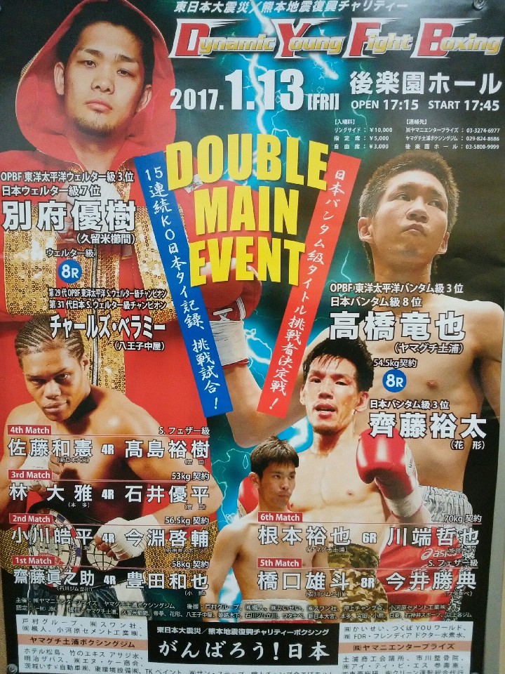 注目:九州のタイソンこと別府優樹(久留米櫛間)が格上の元世界上位ランカーで東洋太平洋と日本王座にも就いていたチャールズ・ベラミーに挑む。チャーリーにとっても健在ぶりをアピールするチャンス。別府は連続KO日本タイ記録が懸かった大一番。2017年も新年早々から熱いリングが楽しめそうだ。